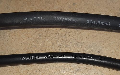 - Bei einigen Heizlüftern werden hochwertigere Leitungen eingesetzt (siehe nachfolgendes Foto...H07RN-F), die u.a. auch besser einer mechanischen Beanspruchung standhalten.