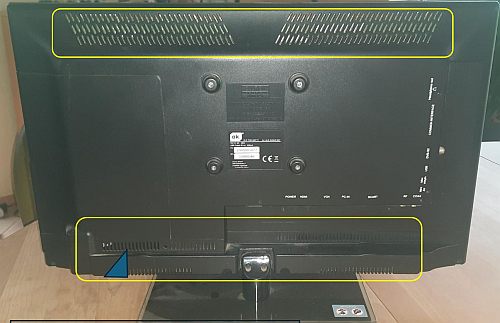 Die Luft Ein- und Auslassbereiche sind bei diesem Fernseher gelb umrandet dargestellt