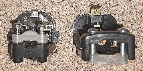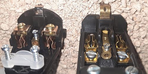 Die Verschraubungen für die stromführenden Leitungen sind bei der linken Schutzkontakt-Kupplung nicht gegen Verdrehen beim Anziehen der Klemmstelle gesichert. Der Leiter wurde beim Anzug nicht sicher geklemmt, obwohl das Anzugsdrehmoment so groß war, dass der Schraubenkopf deformiert wurde. Schlechte Kontaktstellen sind "Zeitzünder für Brände". Das rechte Modell ist von besserer Qualität.