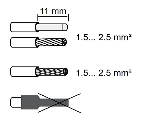 Die Installationsanleitung weist auf das Verwendungsverbot von Aderendhülsen hin.