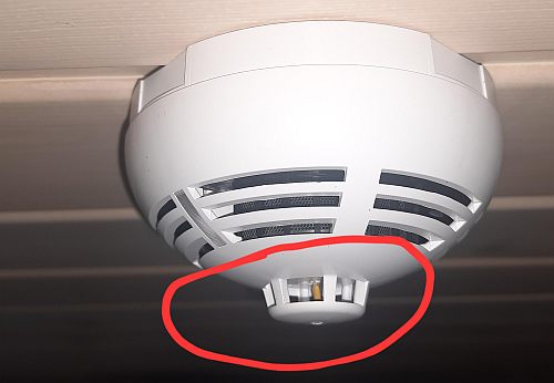 Rot markiert ist der Temperatursensor bei diesem Hitze-&Rauch-Melder